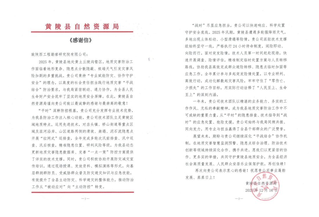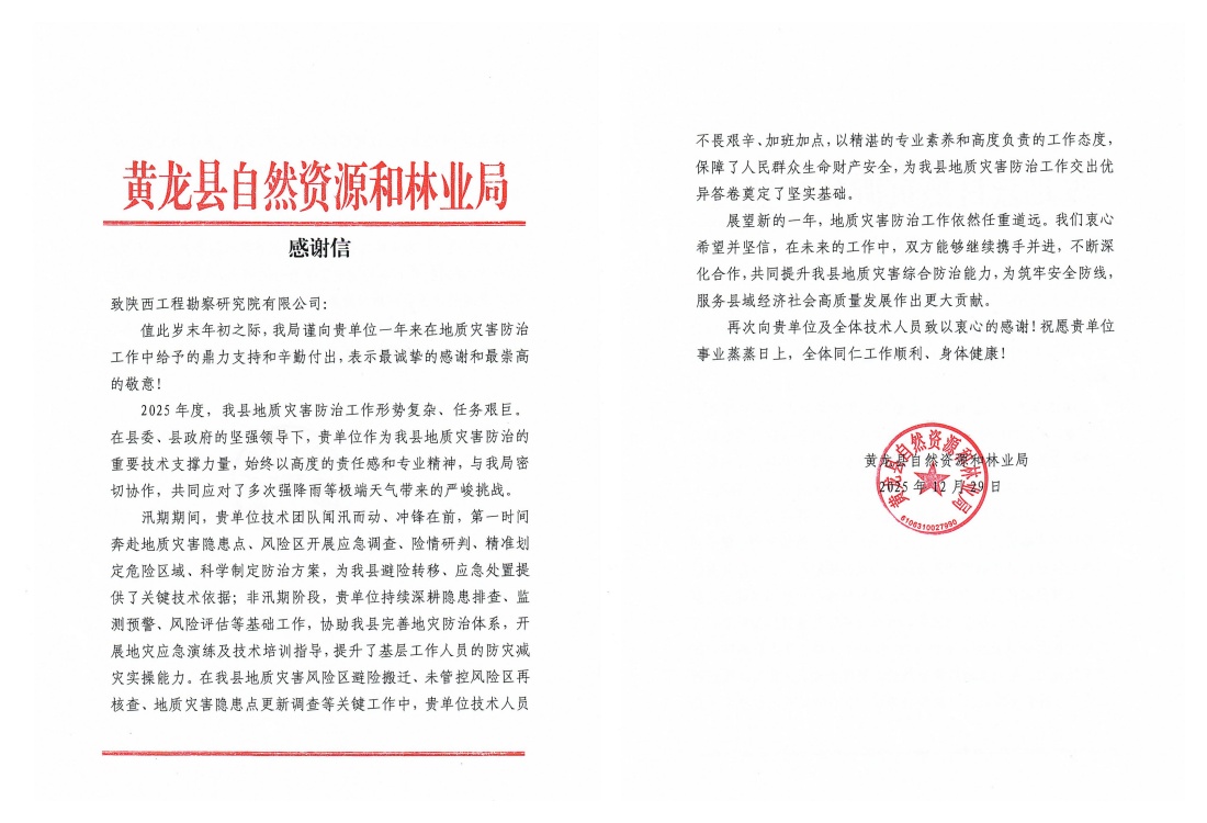 近日,公司接連收到黃陵縣、王益區(qū)、黃龍縣自然資源部門發(fā)來的感謝信,對公司在2025年度地質(zhì)災害技術(shù)支撐工作中表現(xiàn)出的專業(yè)能力、高效響應與奉獻精神給予高度評價和誠摯感謝。