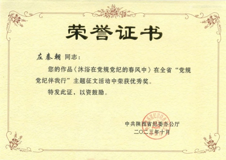 近日,陜西省紀(jì)委辦公廳公布了“黨規(guī)黨紀(jì)伴我行”主題征文活動(dòng)表彰決定,陜西工勘院紀(jì)委選送的由公司紀(jì)委委員、副總工程師左秦朝撰寫(xiě)的《沐浴在黨規(guī)黨紀(jì)的春風(fēng)中》榮獲優(yōu)秀獎(jiǎng)。