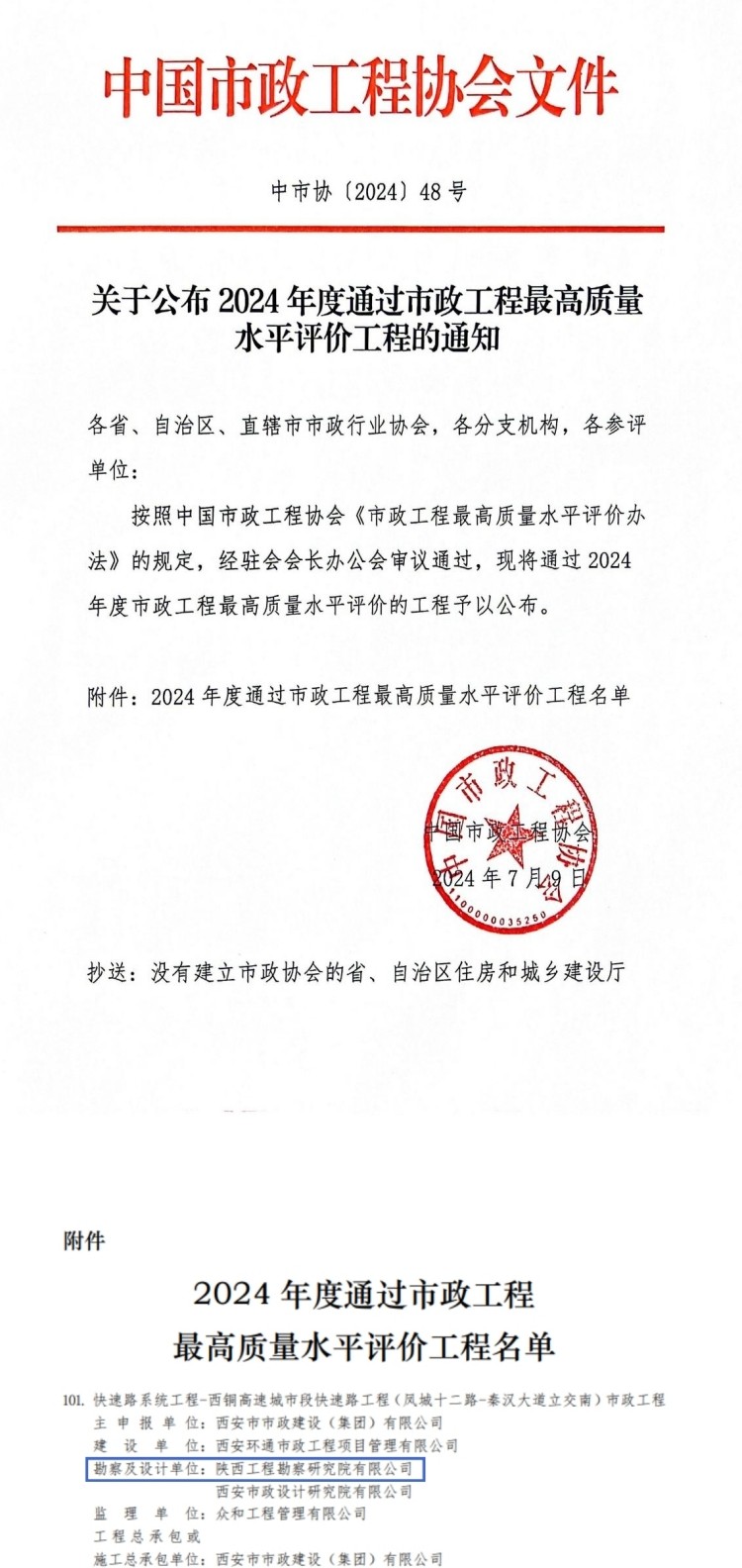 7月9日,中國市政工程協(xié)會(huì)公布了2024年度市政工程最高質(zhì)量水平評價(jià)工程名單,陜西工勘院參建項(xiàng)目名列其中,再次榮獲中國市政工程最高質(zhì)量水平評價(jià)。