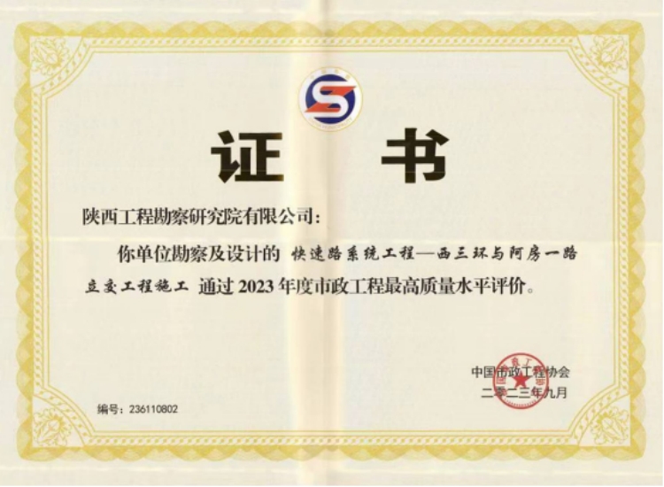 該獎(jiǎng)項(xiàng)由中國市政協(xié)會(huì)組織實(shí)施,代表市政工程行業(yè)同時(shí)期國內(nèi)先進(jìn)水平,獲獎(jiǎng)要求高,評選程序嚴(yán)格,是我國市政行業(yè)在工程質(zhì)量方面的最高榮譽(yù)。此前由我公司負(fù)責(zé)勘察的西三環(huán)與阿房一路立交工程施工項(xiàng)目獲2023年度市政工程最高質(zhì)量水平評價(jià),今年西銅高速城市段快速路工程(鳳城十二路-秦漢大道立交南)市政工程又獲2024年度市政工程最高質(zhì)量水平評價(jià)。連續(xù)兩年榮獲該項(xiàng)“國字”榮譽(yù),充分展示出公司近年來在勘察領(lǐng)域扎實(shí)的專業(yè)功底及人才培養(yǎng)方面取得的突出成效。